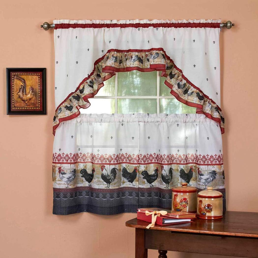 Amazon Com Dsos 3pc Burgundy Grey Rooster Kitchen Tiers Swag Set