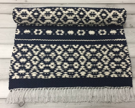 Navy Blue Rag Rug Geometric Pattern Runner Rug Etsy
