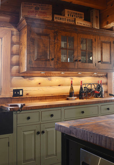 Log Cabin Kitchen Interior Design With Large Honey Color Storage