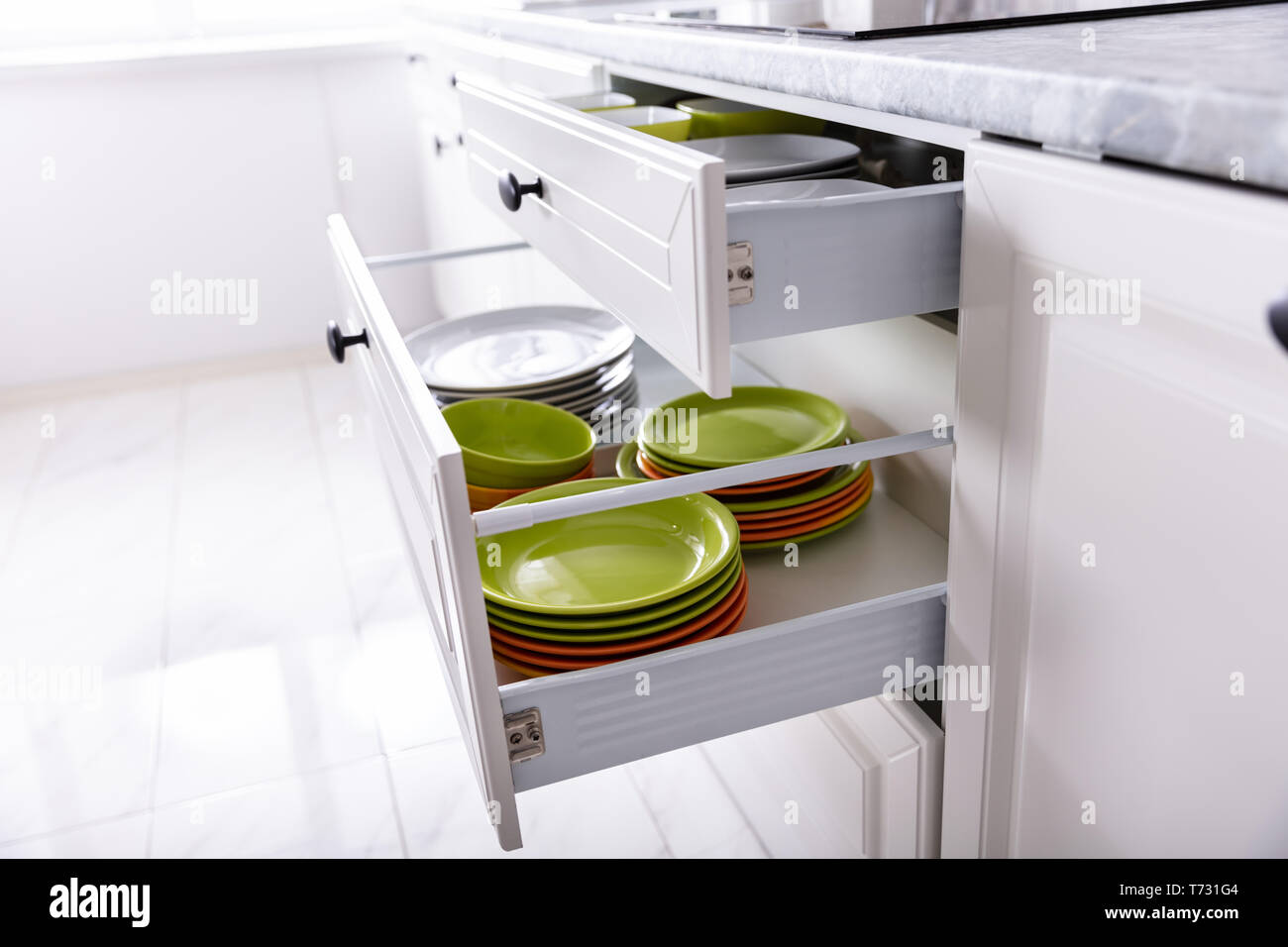 Set Of Different Clean Plates Inside The Opened Drawers In Kitchen