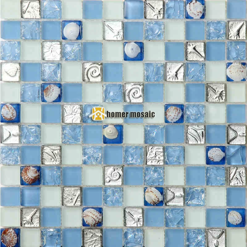 Light Blue Crystal Glass Mixed Sea Shell Mosaic Tiles Ehgm1053a