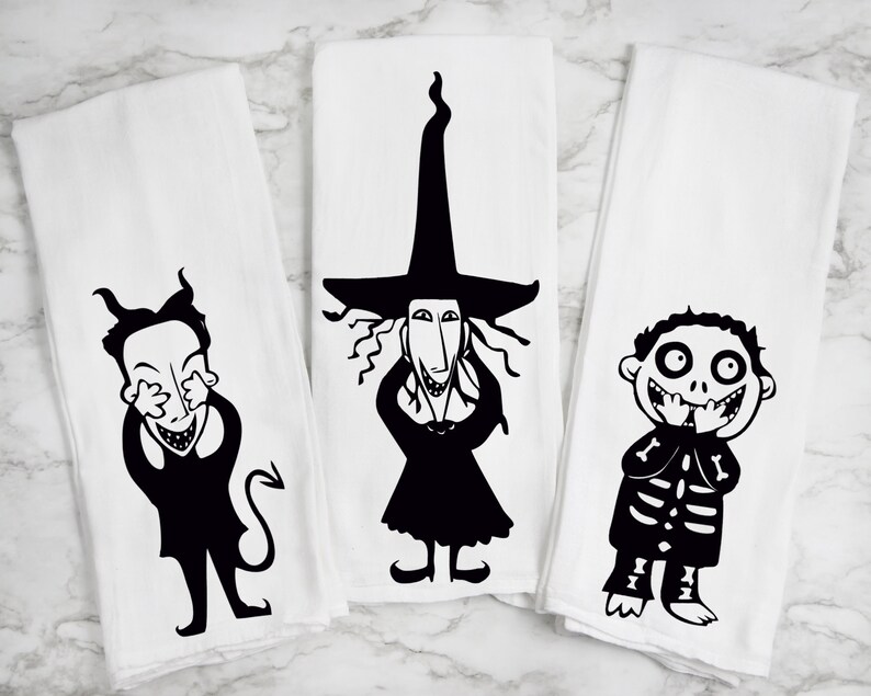 Set Of 3 Halloween Cotton Tea Towels Lock Shock Barrel Etsy