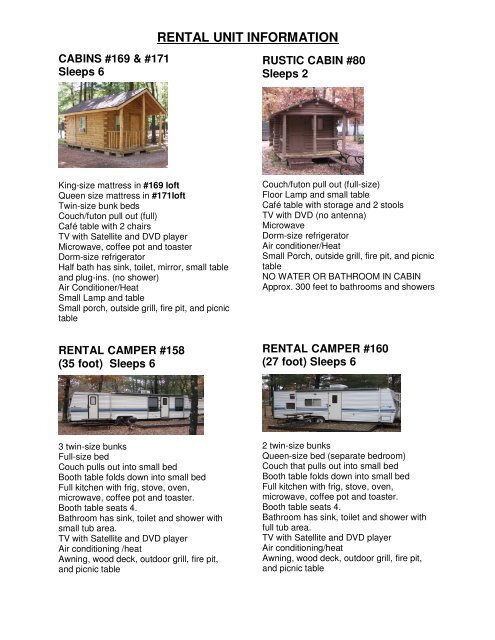 Rental Unit Information Pineland Camping Park