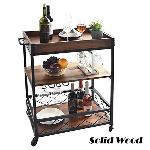 Charahome Solid Wood Kitchen Serving Carts Rolling Bar Cart With 3