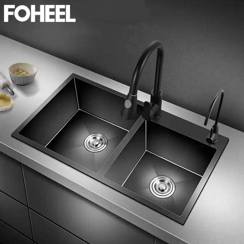 Foheel Black Kitchen Sink Double Bowl Above Black Sink Handmade